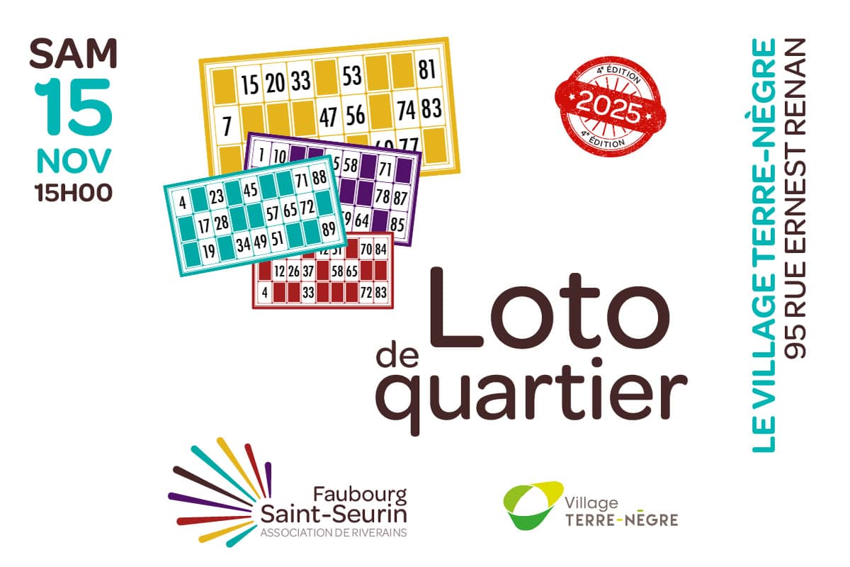 Cette nouvelle édition de notre loto de quartier a eu lieu le samedi 15 novembre de 15h à 20h au village Terre-Nègre, 95 rue Ernest Renan, réunissant grands et petits dans une ambiance du tonnerre !
