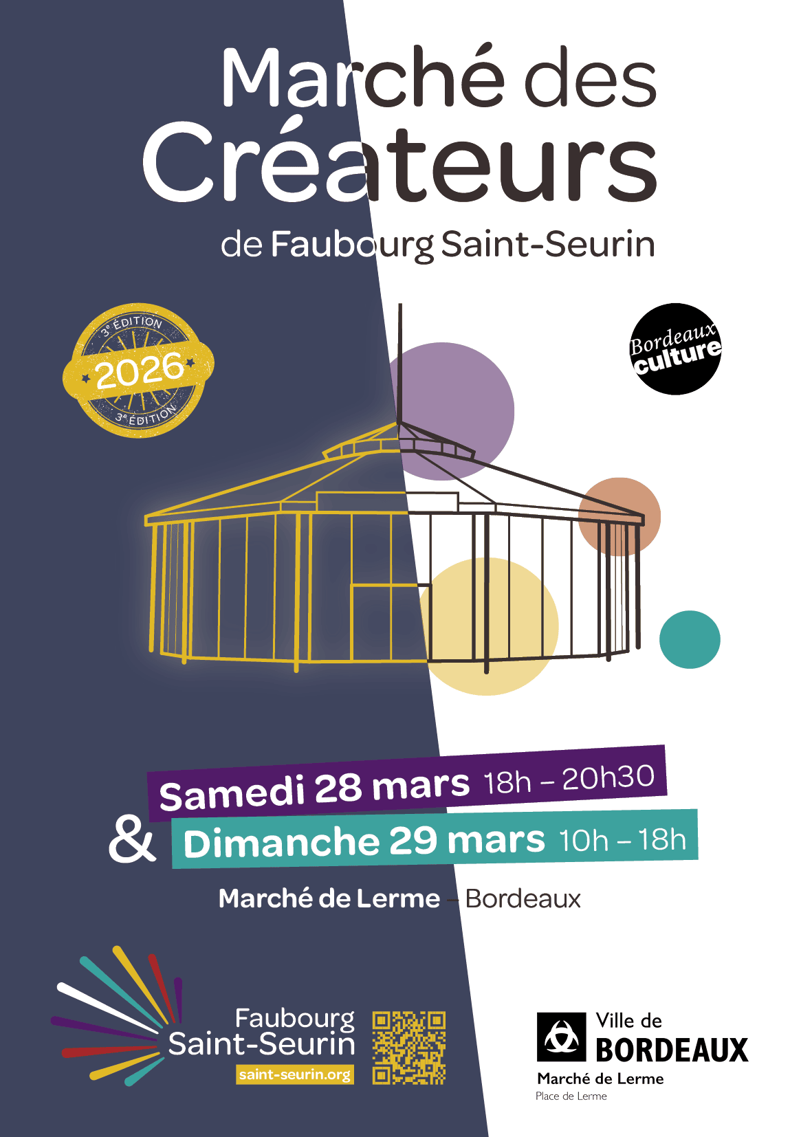 Notre marché se tiendra sur 2 journées, toujours au Marché de Lerme à Bordeaux : le samedi 28 mars en « nocturne » (18h-20h30) et le dimanche 29 mars de 10h à 18h.